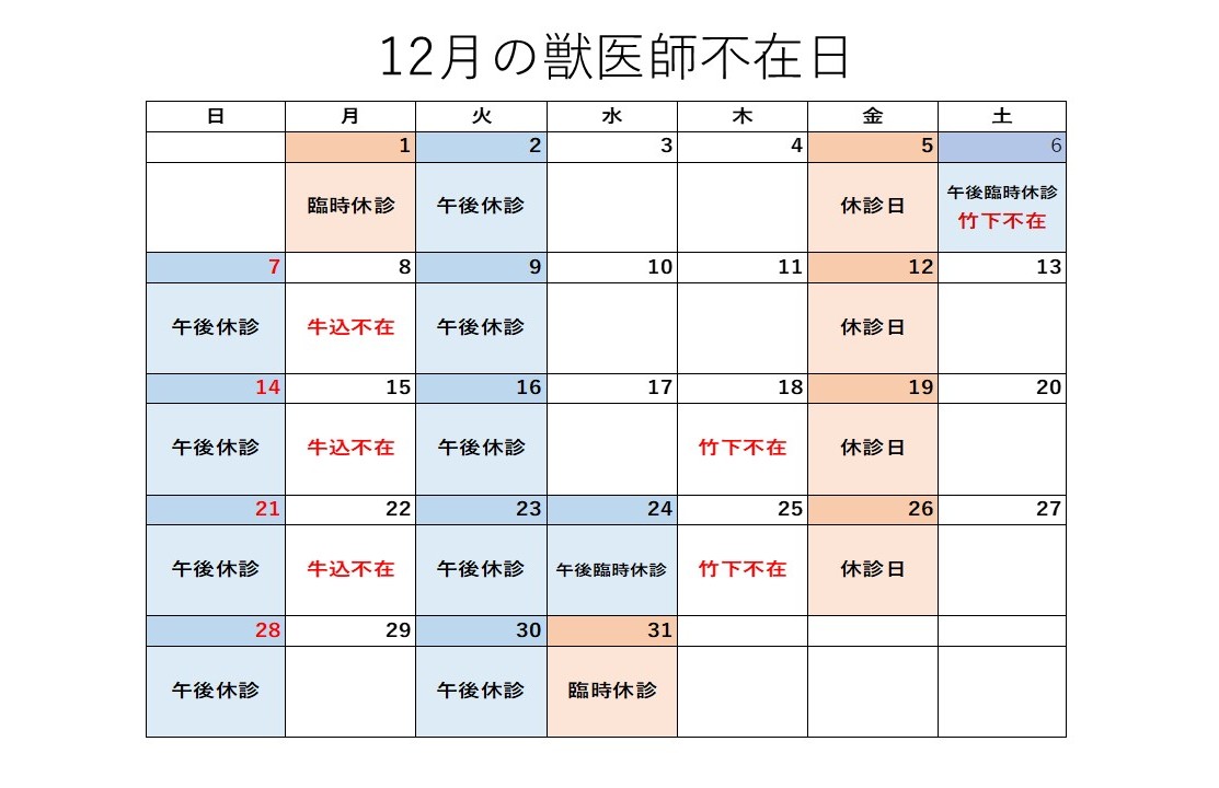 12月の獣医師不在日と臨時休診日 投稿日 2025年11月30日 著者 yukiha カテゴリー お知らせ 12月の下記の日程が臨時休診日となります。・1(月)全日・6(土)の午後・24(水)の午後・年末年始の12月31日~1月3日 ************* クリスマスツリーを飾りました